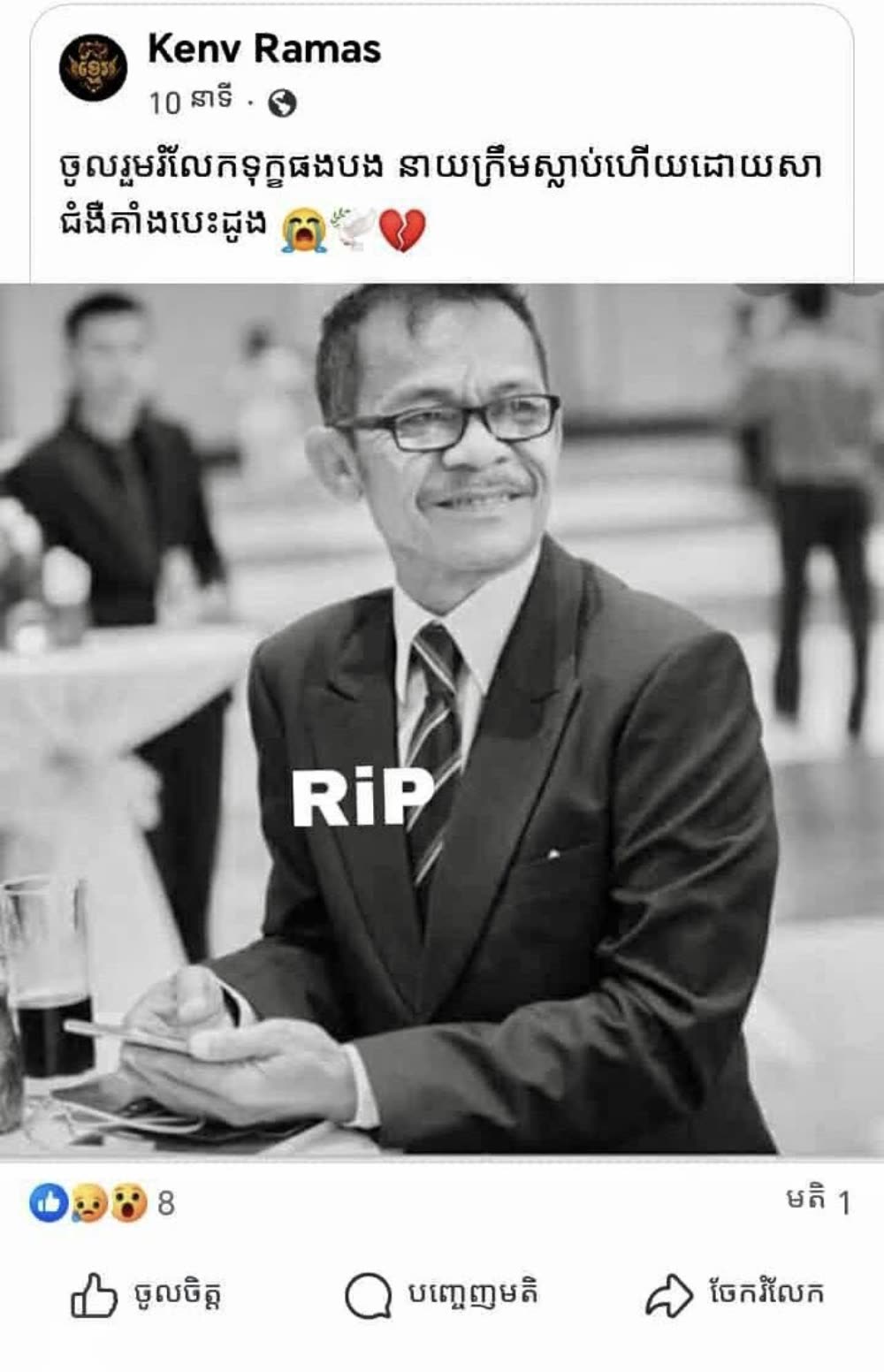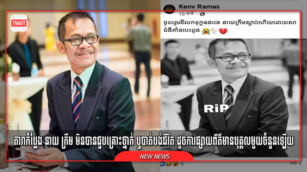 នាពេលថ្មីៗមហាជនអ្នកលេងបណ្ដាញសង្គមកំពុងមានការភ្ញាក់ផ្អើលជាខ្លាំង ខណៈបានឃើញការបង្ហោះរបស់ជនខិលខូចមួយចំនួនបានចែកចាយនូវព័ត៌មានមិនពិតដោយបានប្រកាសថា តារាកំប្លែង នាយ ក្រឹម បានទទួលមរណភាពដោយសារជម្ងឺគាំងបេះដូង ដោយនេះជាការប្រមាថយ៉ាងខ្លាំងដ៏អាយុជីវិត និងធ្វើឲ្យមហាជនជាច្រើនមានការយល់ច្រឡំ។