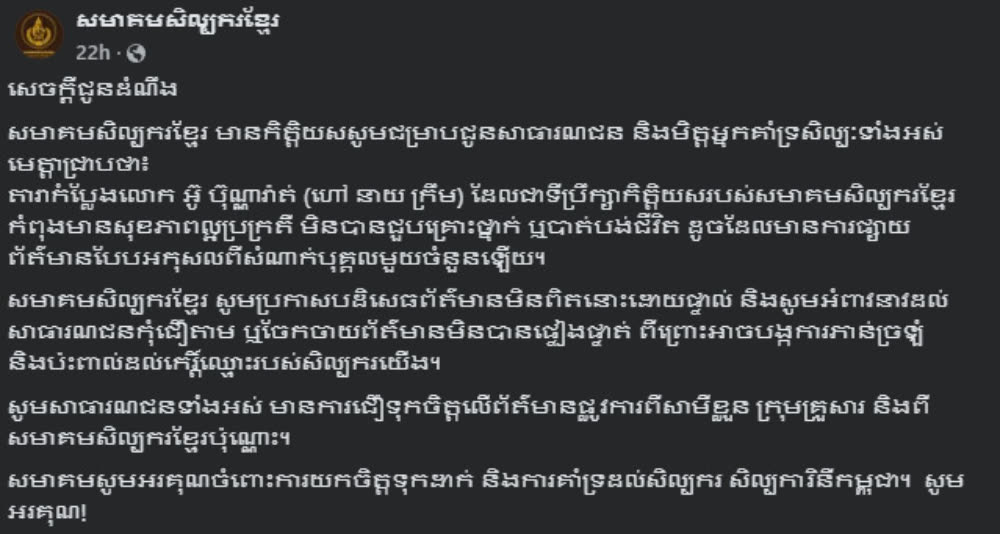 សមាគមសិល្បករខ្មែរ ប្រកាសបដិសេធព័ត៌មានមិនពិតនោះដោយផ្ទាល់ និងអំពាវនាវដល់សាធារណជនកុំជឿតាម ឬចែកចាយព័ត៌មានមិនបានផ្ទៀងផ្ទាត់ ពីព្រោះអាចបង្កការភាន់ច្រឡំ និងប៉ះពាល់ដល់កេរ្តិ៍ឈ្មោះរបស់សិល្បករកម្ពុជា។